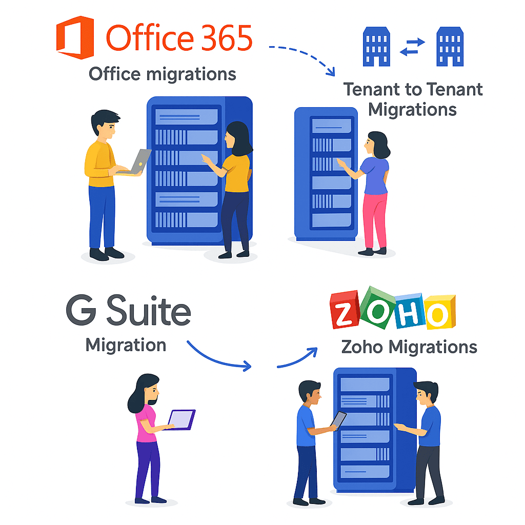 We specialize in seamless migration services tailored to meet your business needs—whether you're moving to Microsoft 365, transitioning between Office 365 tenants, or migrating to/from platforms like G Suite or Zoho. Our expert team ensures a smooth, secure, and efficient transfer of emails, calendars, contacts, and files with minimal disruption to your operations. From tenant-to-tenant consolidations to full-suite cloud transitions, we handle every step with precision and compliance. Trust us to simplify your migration journey and help you embrace the power of modern collaboration platforms with confidence.